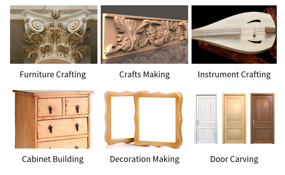 1- الأعمال الخشبية: الأبواب الخشبية والأثاث، والنوافذ، والطاولات والكراسي، والخزائن والألواح، واللوحات الموجية ثلاثية الأبعاد، و MDF، ومكتب الكمبيوتر، والآلات الموسيقية، إلخ